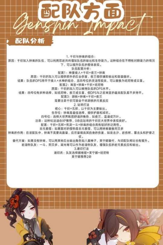 配置:千织+五郎+荒泷一斗+钟离的组合具有较好的泛用性。