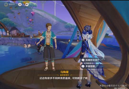 对话选项:有哪些区别?—泡温泉的外国人多吗?—可能是酥酥麻麻的把。