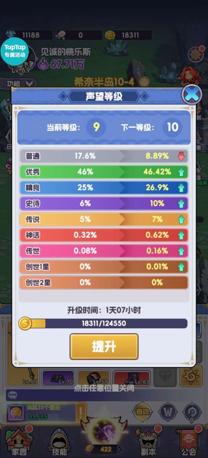 3.声望等级,毋庸置疑的,这个和我们的装备掉落品质挂钩!所以我们能提升就提升,我们前期加入公会后,公会援助可以优先选择我们的加速卷。