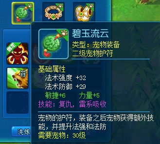 除了饰品可以戴,还有另外三件物品戴上去也是可以增强宠物——护符、铠甲、项圈。这三大件宠物装备可以全方位提升宠物属性,护符更是不得了,还携带技能,如果不是自己想要的技能,还可以用护符洗练丹重置一下技能,让宠物如虎添翼。