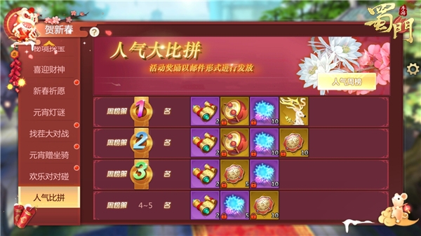 活动结束后,最终在人气排行榜上前5名的玩家将可获得相对应的奖励。排名第一的玩家将获得永久S级单人坐骑【长生鹿】、永久称号【明日之星】、洪福齐天与曲动情丝道具奖励。