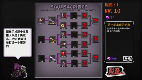 此外游戏也是保留了一点善意,每局结束玩家都能祭献获得的怪物灵魂换取永久的能力。技能树包括基础的血量移速等属性加成,也有不乏改善战局的buff