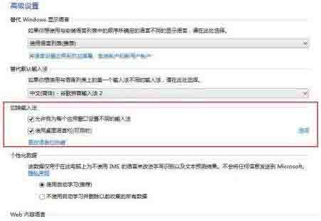 进入语言“高级设置”界面,在“切换输入法”下,可以勾选“允许为每个应用设置不同的输入法”以及“使用桌面语言栏(可用时)”。这样可能会更加符合之前习惯的输入方式;
