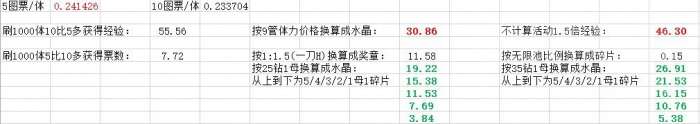 除去我认为比较异常以及不适合纳入计算范围的数据后,最终计算22次活动、共56800*2体力,得到了1-5和1-15的票收益。