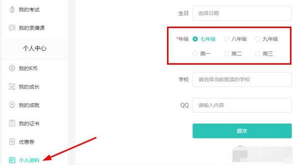 1、选择正确的年级是至关重要的,虽然用户在登录进入开课啦直播电脑版时就可以选择年级,但如果你不小心选错了年级,只需在个人资料中在“年级”一栏进行修改,如下图所示: