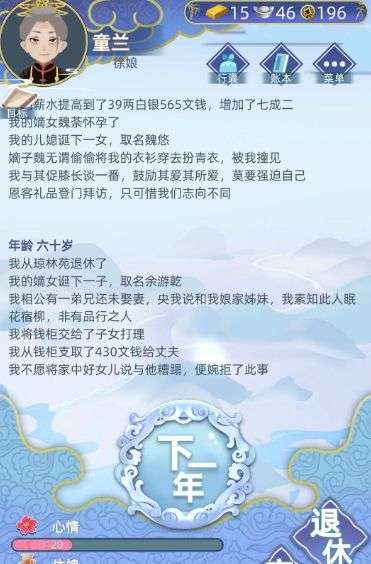 培养系统,钱柜中还可以花钱进行培养,增加子女能力,也可以送不乖巧的笨蛋丈夫去寺庙吃斋念佛哈哈哈哈…