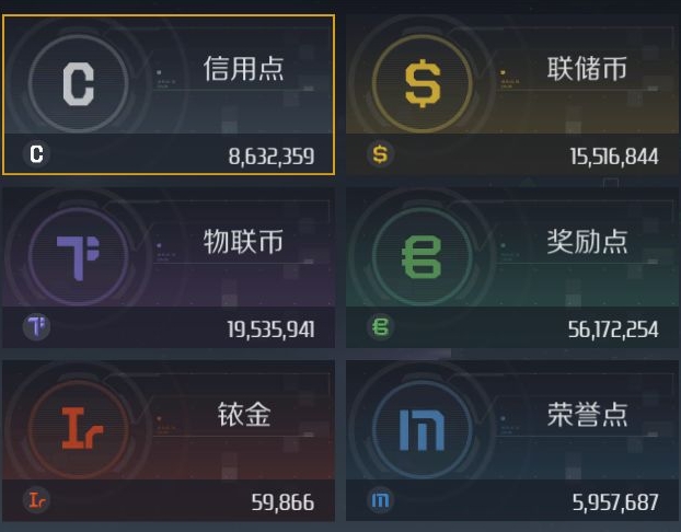 二银里面有六种货币,分别是:信用点、联储币、物联币、奖励点、铱金、荣誉点。其中除了铱金之外的五种币也被我们根据颜色分类简称为“蓝黄白紫绿”币。接下来就让我们先来了解一下吧。