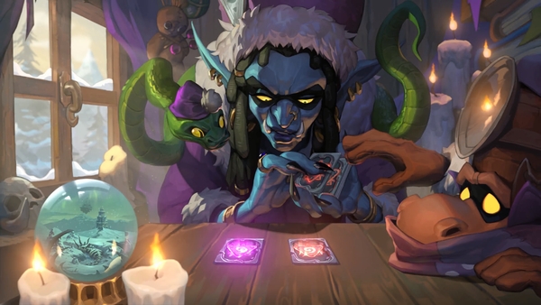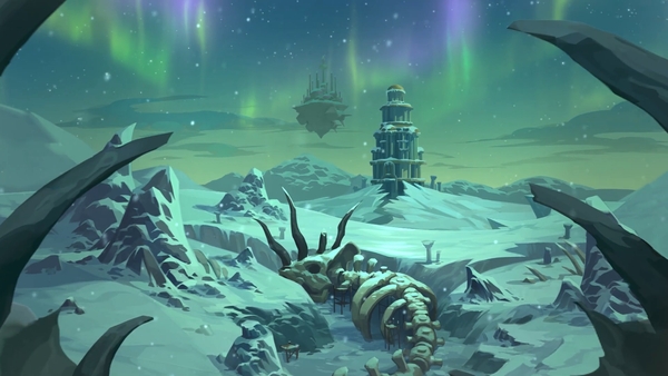 在视频中,拉祖尔女士正在通过塔罗牌对未来进行预测,代表力量的紫色和橙色光芒在卡牌背面不停地闪动。桌子角落的水晶球中,展现了诺森德龙骨荒野的冰冻废土,矗立在泰坦之路上的龙眠神殿和巨龙年的主角地点:达拉然。