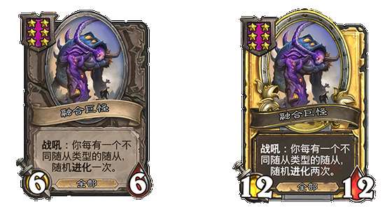 酒馆战棋随从池更新 海盗不再必定出现在每一场酒馆战棋对战中。 新随从 融合巨怪 [等级6,全部] 6点攻击力,6点生命值 战吼:你每有一个不同随从类型的随从,随机进化一次。