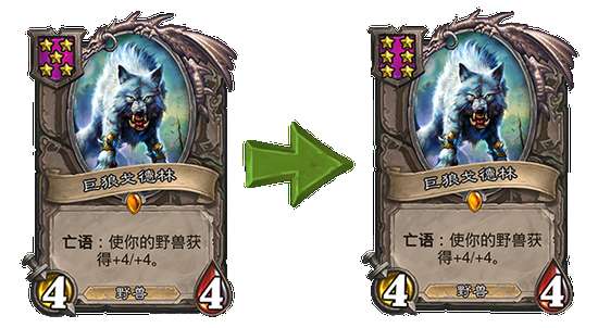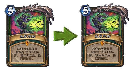 恶魔变形 旧:将你的英雄技能替换为“造成5点伤害。”使用两次后,换回原技能。 →新:将你的英雄技能替换为“造成4点伤害。”使用两次后,换回原技能。