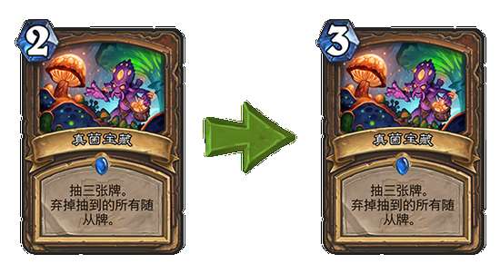 真菌宝藏 旧:[2点法力值消耗] →新:[3点法力值消耗]。
