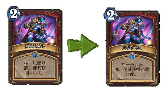 海盗藏品 旧:抽一张武器牌。使其获得+1/+1。 →新:抽一张武器牌。使其获得+1耐久度。