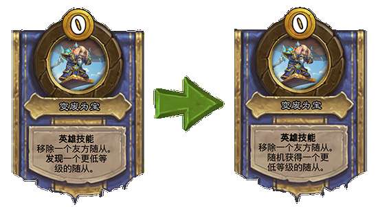 钩牙船长 变废为宝[消耗0枚铸币]旧:移除一个友方随从。发现一个更低等级的随从。 →新:移除一个友方随从。随机获得一个更低等级的随从。
