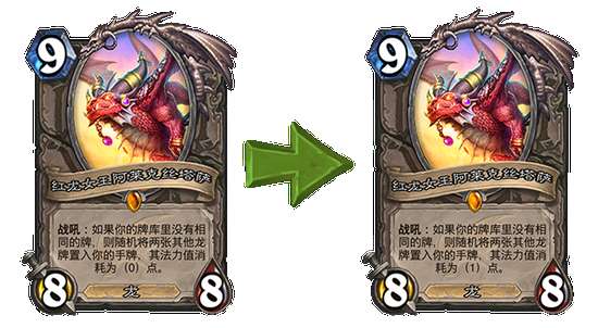 梦魇巨龙迦拉克隆 旧:战吼:抽一张牌,其法力值消耗为(0)点。 →新:战吼:抽一张牌,其法力值消耗为(1)点。 天降浩劫迦拉克隆(潜行者) 旧:战吼:抽两张牌,其法力值消耗为(0)点。 →新:战吼:抽两张牌,其法力值消耗为(1)点。 世界末日迦拉克隆(潜行者) 旧:战吼:抽四张牌,其法力值消耗为(0)点。 →新:战吼:抽四张牌,其法力值消耗为(1)点。