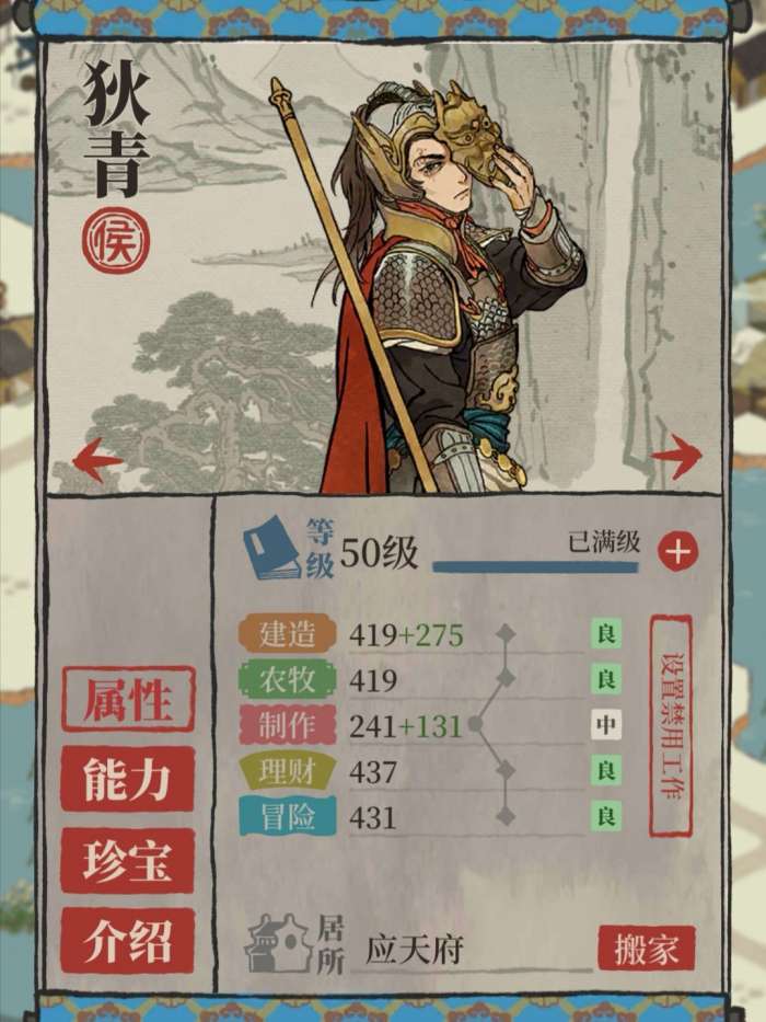 比较尴尬的是属性太过平均,能力生效是说书人出现后的时间。前期放苏州,但不着急升级,后期需要特殊居民的工作可配珍宝开展。