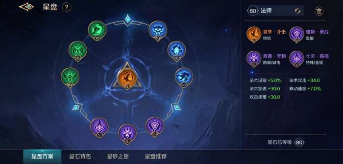 星盘我推荐这套,在保证输出的同时,还有超强吸血(紫色雄狮,血量越低吸血越多)。这套星盘兼顾爆发、续航、移速、经济、减伤的同时,还稍微带点攻速。