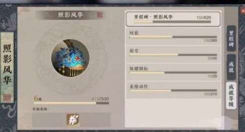 照影风华主要是关于表情动作、时装、称号、图标的成就。玩家在收集相对应的物品之后就会有成就完成。天刀手游中的收集成就要比端游更加全面。