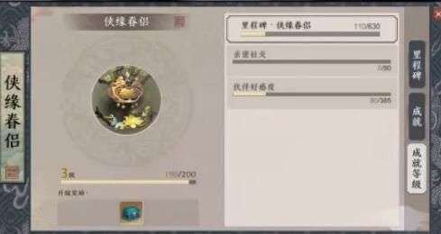侠缘眷侣中主要是跟伙伴一起的成就,互动、分享、好感度等级、约会、信件。玩家与伙伴之间的点点滴滴都会记在成就里面哦~当然不仅仅是伙伴,还有玩家与玩家之间的成就,好友、组队、互动之类的。