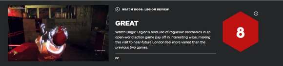 IGN为《看门狗:军团》打出了8分的好评。评测者认为《看门狗:军团》在一款开放世界的动作游戏中大胆使用了Roguelike机制,以一种有趣的方式进行反馈,使得这款即将到来的伦敦之旅比前两款游戏更加丰富多彩。