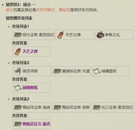证据选择:天芒之牌、数封密信、城镇图纸、任三证言胡大、梅如花证言施舍。