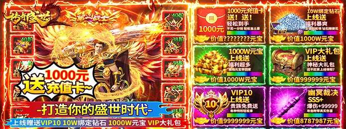 【传奇盛世2】送1000元充值卡,,开启属于你的盛世时代,上线VIP10,10W绑定钻石,1000W元宝,次日即可免费升级满V,激活VIP,可尊享:免费无限传送,攻击石化敌人,伤害大幅度加成,伤害免减,免费原地复活,送钱我们是认真的,要的就是真实,全区已送出N钻石