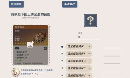 操作方法:只需要把自己圣遗物的截图传到左边的框中就可以对圣遗物进行评分,如果截图不方便的话,也可以在右侧手动输入自己圣遗物的相关属性。