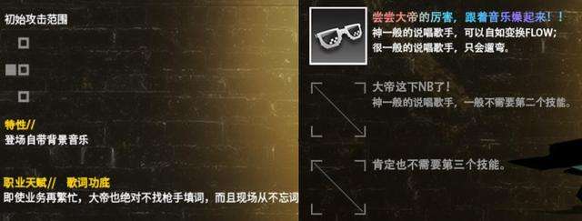 而在这位七星干员的技能和天赋描述上,也非常符合大帝那霸气的身份。虽然作为七星干员的他仅有1个“自由变换FLOW”说唱歌手技能,但是在剩余两个技能栏中却强调了大帝是不需要多个技能的强者,非常符合他不死身的设定。并且在角色立绘和配音上,鹰角也玩了一下“黑兔脸”的梗,表示新角色是由画师本人配音。