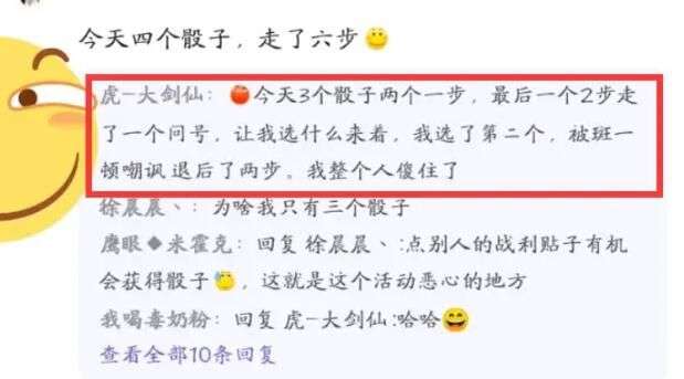 简单来说,每天完成活动的日常任务是可以稳拿三个骰子,然后也可以通过别人分享的活动中有概率开出骰子。因为除了常规的骰子以外,还有起舞值的设定,100起舞值可以兑换一个骰子,每天起舞值会多出20,慢慢累积以后,也会在其中的几天中稳拿四个骰子。所以,我之前计算的就是活动期间至少会有40+骰子,整个活动也就只有120步,按照概率问题,平均每个骰子保证在3左右就可以了。但我还是低估了非酋玩家的运气,上面那位兄弟就是三个骰子也就走了两步,我每次碰到随机事件基本上都是会奖励前进步数,还真没碰到过倒退的情况。