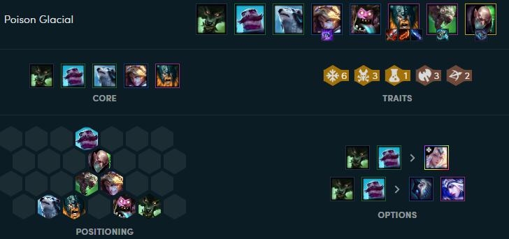 阵容解析:该阵容的主要方式是极地的控制以及剧毒持续消耗,奥拉夫作为前排,配合吸血装备开启大招后可以持续吸血保证生存能力。
