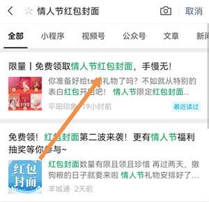 1、首先登录微信,在微信搜索框中输入“情人节红包封面”的关键词字样;