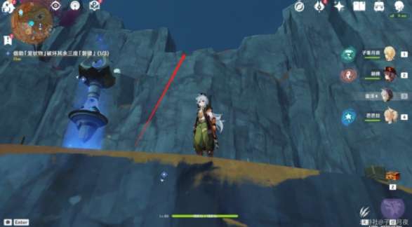 传送到附近锚点,然后爬过后面那座山,可以看到有个坑,跳下去就可以看到磐键了,存在高度差,需要按顺序来,否则瞄不准打不到磐键;