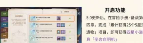 2、5.0更新后,在冒险手册·备战第四章中完成[累计获得25个5星圣遗物]任务后,即可获得圣言自明机。