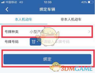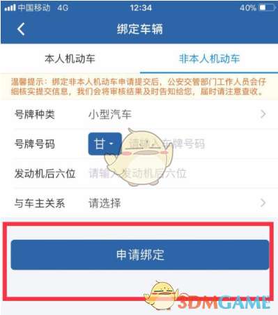 4、点击“申请绑定”(如果不是车主,点击非本人机动车,填写车辆信息然后点击“申请绑定”)
