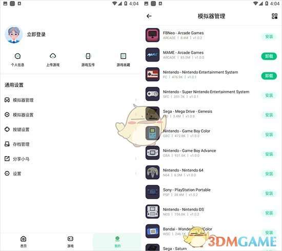 10.注册账号后,还能把自己的游戏上传至平台,或使用互传功能与朋友分享资源;模拟器管理界面里也能看到各平台核心组件,自行选择安装与卸载。