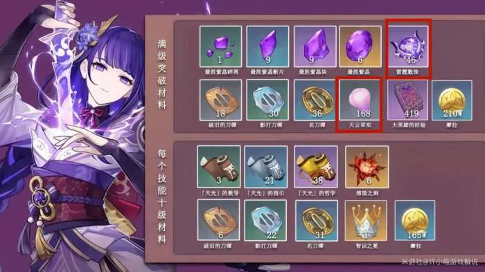 养雷电将军的成本很低,而天云草实的材料集中度也很高。打完雷音权现后,玩家可以直接采集材料,特别是在5.0版本后,刀镡的数量也增加了。因此,升级材料不难找,不用像白术、纳西妲那样的材料那么难找。