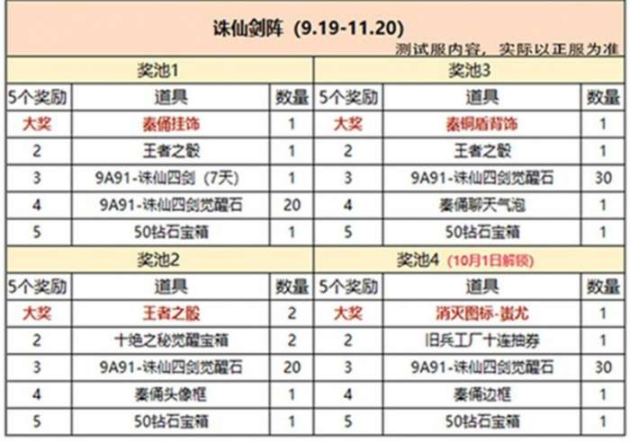接下来一起来看看每个奖池的核心奖励,本次活动四个奖池的核心奖励各不相同,这里也给大家整理了一下:第一轮奖池的核心大奖是秦俑挂饰,同时可以获得9A91-诛仙四剑(7天),大家届时可以先行体验一番;第二轮奖池的核心大奖是飞行棋所需要的王者之骰;第三轮的核心大奖则是秦铜盾背饰,是收藏价值很高的背饰道具;最后一轮的核心大奖是消灭图标-蚩尤,也是在本次活动中返场了,需要注意的是,最后一轮是在10月1日解锁,最后一轮抽完后,会集齐全部的觉醒石,就可以觉醒9A91-诛仙四剑,我也将奖励整理了一下,大家可以参考看看: