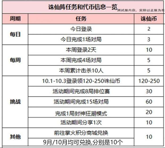 本次活动的抽奖代币是诛仙币,是可以通过日、周、挑战和其他任务获得,规则比较简单,这里我同样将我们可以获得的路径和数目整理出来,大家可以看看~