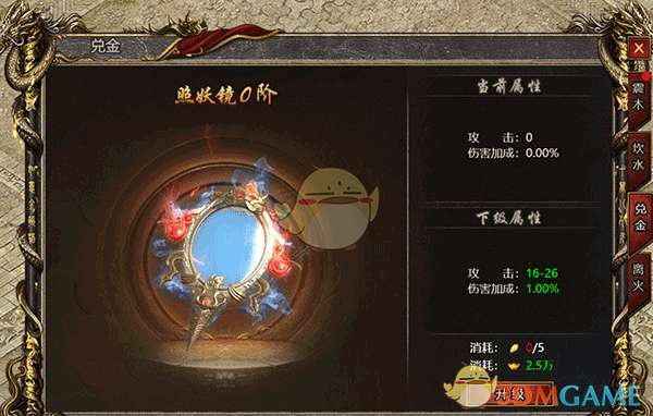 4、兑金对应的仙宝是照妖镜,所对应的加成属性是攻击力,提升伤害加成,升阶所需要的材料是兑金精华和绑定元宝;