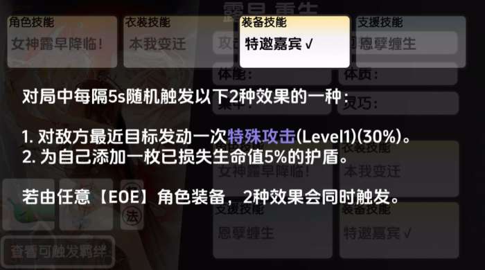 露早的装备技能可以选择特邀嘉宾,这个装备技能带来的效果是对局中每隔5秒都会随机触发以下2种效果的一种,第一个就是对敌方最近目标发动一次特殊攻击,第二个是为自己添加一枚已损失生命值5%的护盾,如果此时是由任意EOE角色进行装备的话,这2种效果会同时触发哦,最后露早还有一个支援技能叫做恩孽缠生,是在己方角色受到攻击时可以用到的支援效果,此时会扣除攻击者当前生命值2%的生命,并且同时回复受攻击者等量生命,每名角色每8秒时间只能只能触发一次。