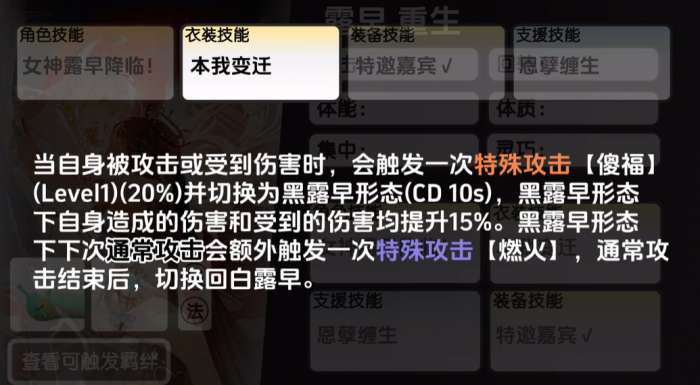 她的衣装技能叫做本我变迁,是当露早被攻击或受到伤害时,会触发一次特殊攻击,这一次的特殊攻击叫做【傻福】,同时切换为黑露早形态,这个状态的时间有10秒,黑露早形态下自身造成的伤害和受到的伤害均提升15%的数值,且黑露早形态下下次通常攻的会额外触发一次特殊攻击【燃火】,通常攻击结束后,会再次切换回白露早的状态。