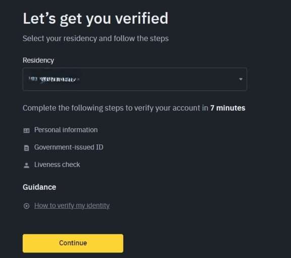 第 2 步:创建帐户后,您需要验证您的身份。请记住,在深入了解“如何交易迷因币”部分之前,这对于确保您的帐户安全非常重要。首先选择您的居住地。