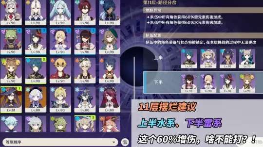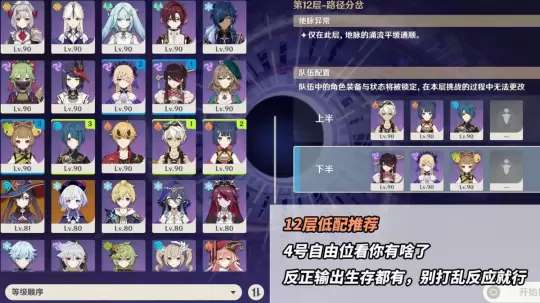 建议在12层上半使用转火能力强的队伍,因为敌人存在多波次、多目标和较多火盾,不建议选用纯爆发类型、个体标记类型或小圈作战类型的队伍。建议队伍内至少有1名破盾优势的水系角色。即使使用超低配班尼特、香菱、行秋和自由位也可以应对挑战。
