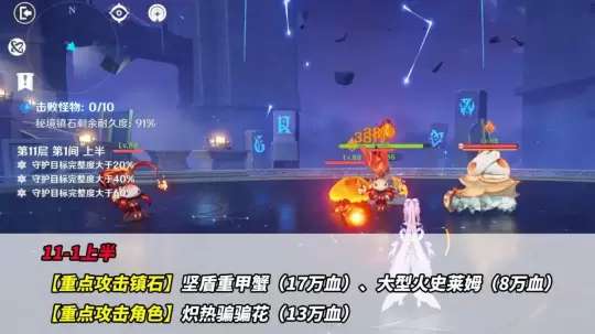 经典失误场,11-1区域里的BOSS镇石非常强大。在上半场,我们需要特别留意坚盾重甲蟹(拥有17万的血量)和大型火史莱姆(拥有8万的血量),因为它们都会优先攻击镇石。务必先处理它们!而对于炽热骗骗花(拥有13万的血量),只要能够吸引仇恨,就不用担心它了,因为它会一直追着你打。