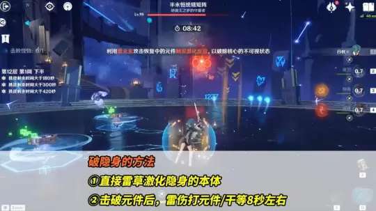 有三种方式可以让隐身状态的对象显形。第一种方式是直接寻找到隐身的本体,使用雷草进行激化,使其瘫痪显形。第二种方式是打破召唤的元件,让元件进入修复状态,然后使用雷伤对修复元件进行打击,直接将其瘫痪显形。第三种方式是打破召唤的元件并等待大约8秒钟,本体将会出现。在从显形到再次隐形之间,有至少10秒的输出时间,可以放心地使用各种技能。