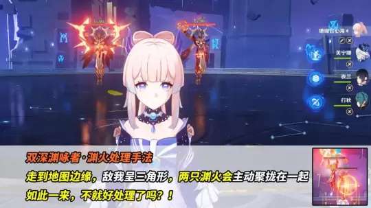 本期深渊上半的11-2、12-1和12-3层都有深渊咏者·渊火,因此建议队伍中至少带有一个水系角色,用于消除元素盾。当11-2和12-3上半出现两只渊火时,若队伍的水系角色无法具备超大范围的水元素攻击,建议前往地图的边缘,使敌我双方分别呈三角形的站位,以迫使渊火靠前,从而实现聚怪的效果。另外,如果选择逐个击败敌人,虽然可以成功地完成,但是需要耗费更多的时间。这时,下半场就会变得更加具有挑战性和压力。