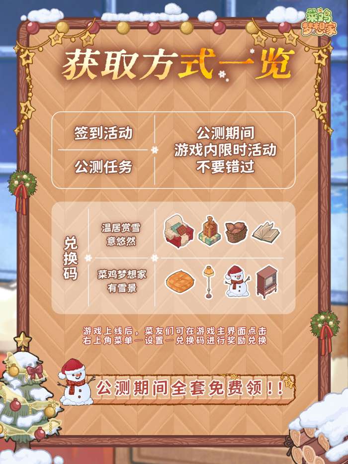 《菜鸡梦想家》将于12月27日公开测试,公测活动期间,菜友们可以免费获取完整「雪窗暖阁」套间(共29件,内含边框、发光屋顶等等)