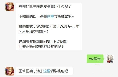 王者荣耀1月13日每日一题:飞典韦的鼠年限定皮肤名叫什么呢?(答题格式:wz+答案,例如答案是王者荣耀,则输入:wz王者荣耀)正确答案:WZ岱宗