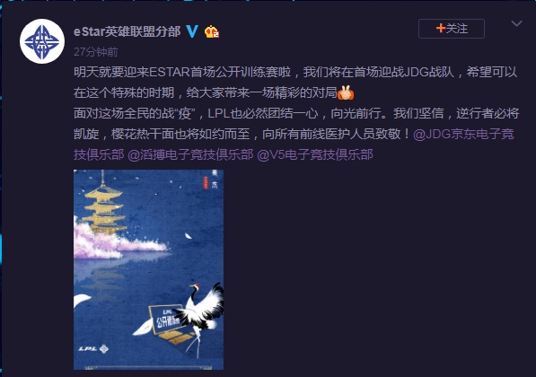 据eStar英雄联盟分部官方微博消息:明天就要迎来ESTAR首场公开训练赛啦,我们将在首场迎战JDG战队,希望可以在这个特殊的时期,给大家带来一场精彩的对局。