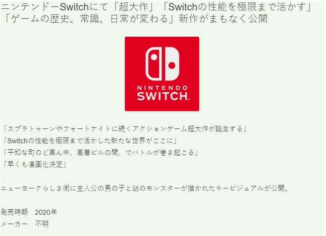 据速报的描述,这款作品号称是继《喷射战士》和《堡垒之夜》后的动作游戏超大作;在和平小镇和高楼大厦之间展开战斗;并且该作还会推出漫画作品。将公开在纽约街头,男主人公与谜之怪物的主视觉图。