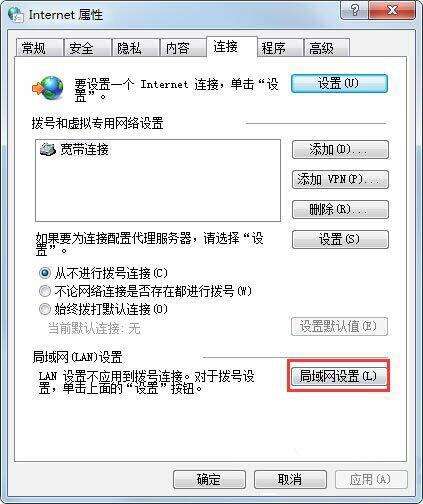 2.在“Internet 选项”对话框下,点击“连接”选项卡,然后点击“局域网设置”按钮。如图所示: